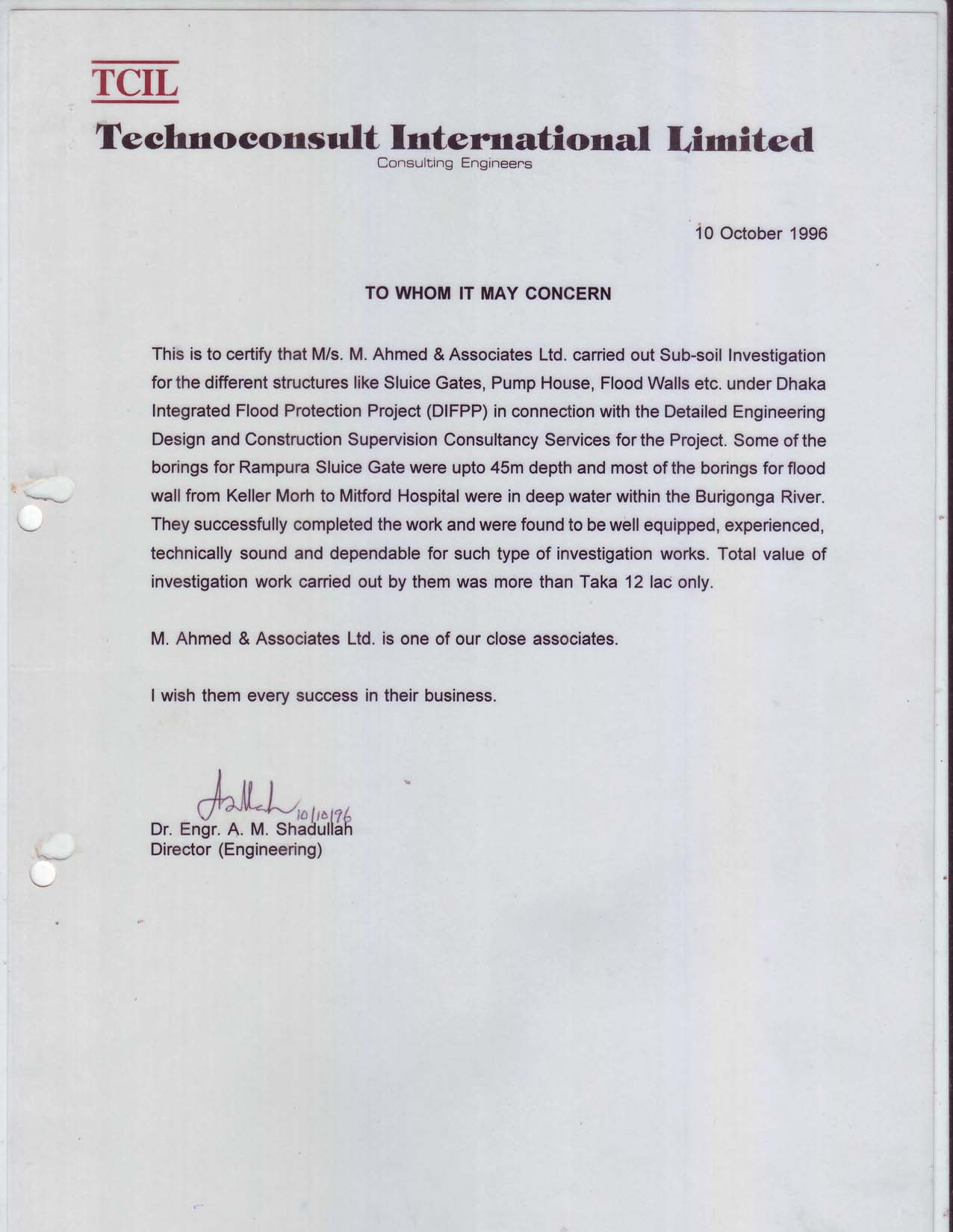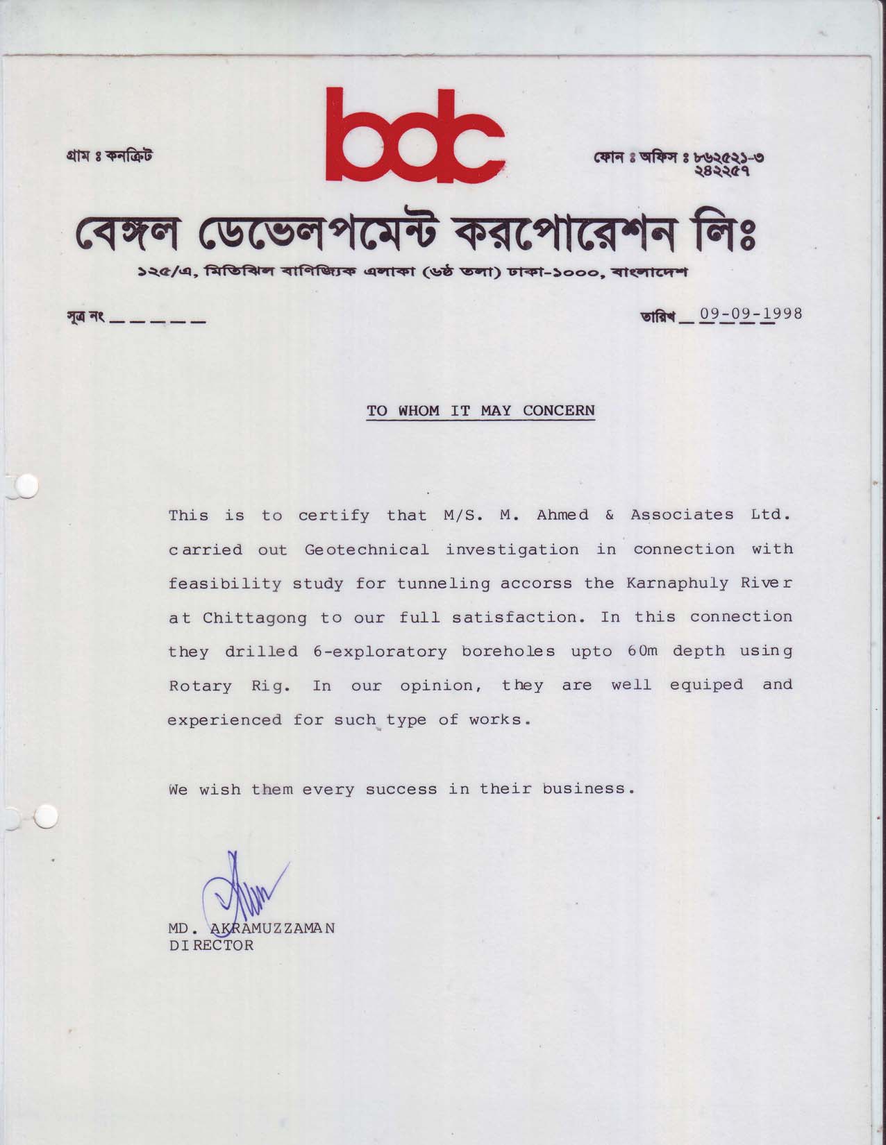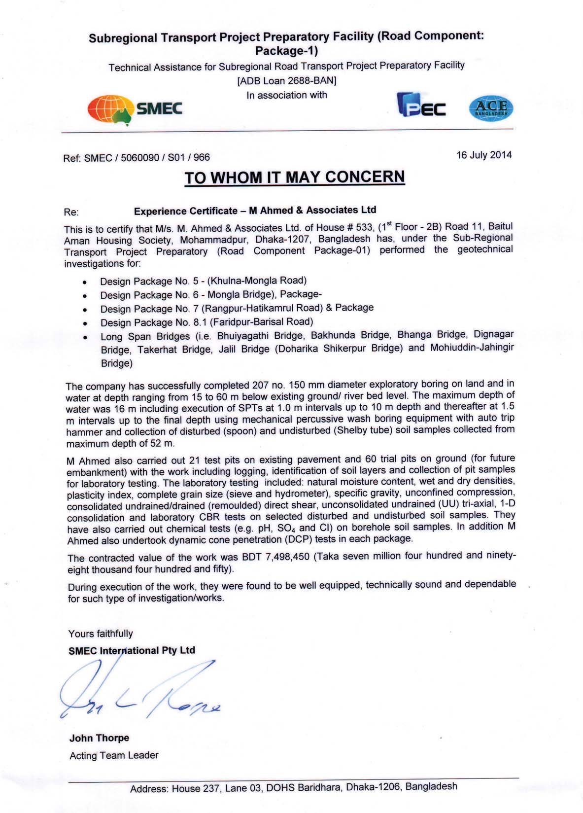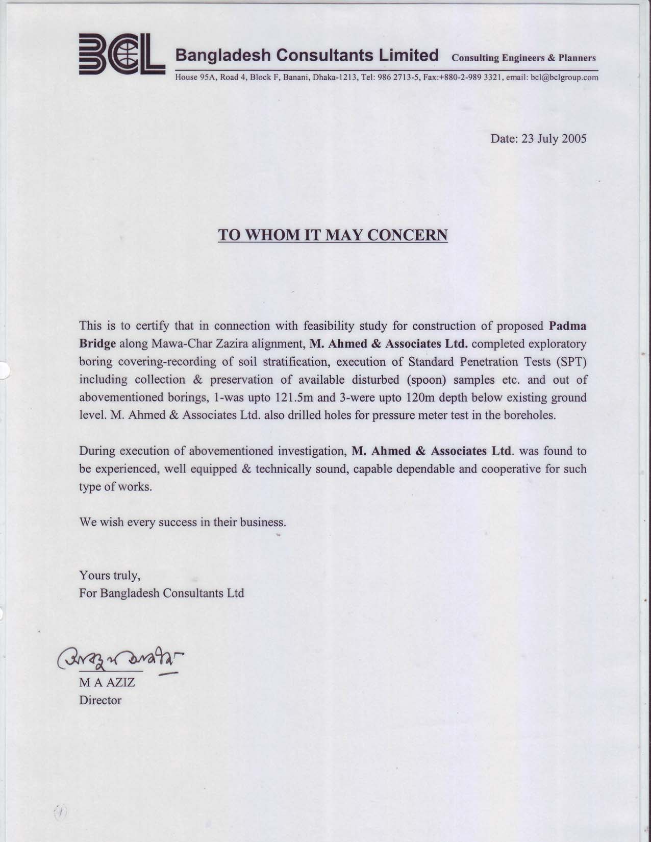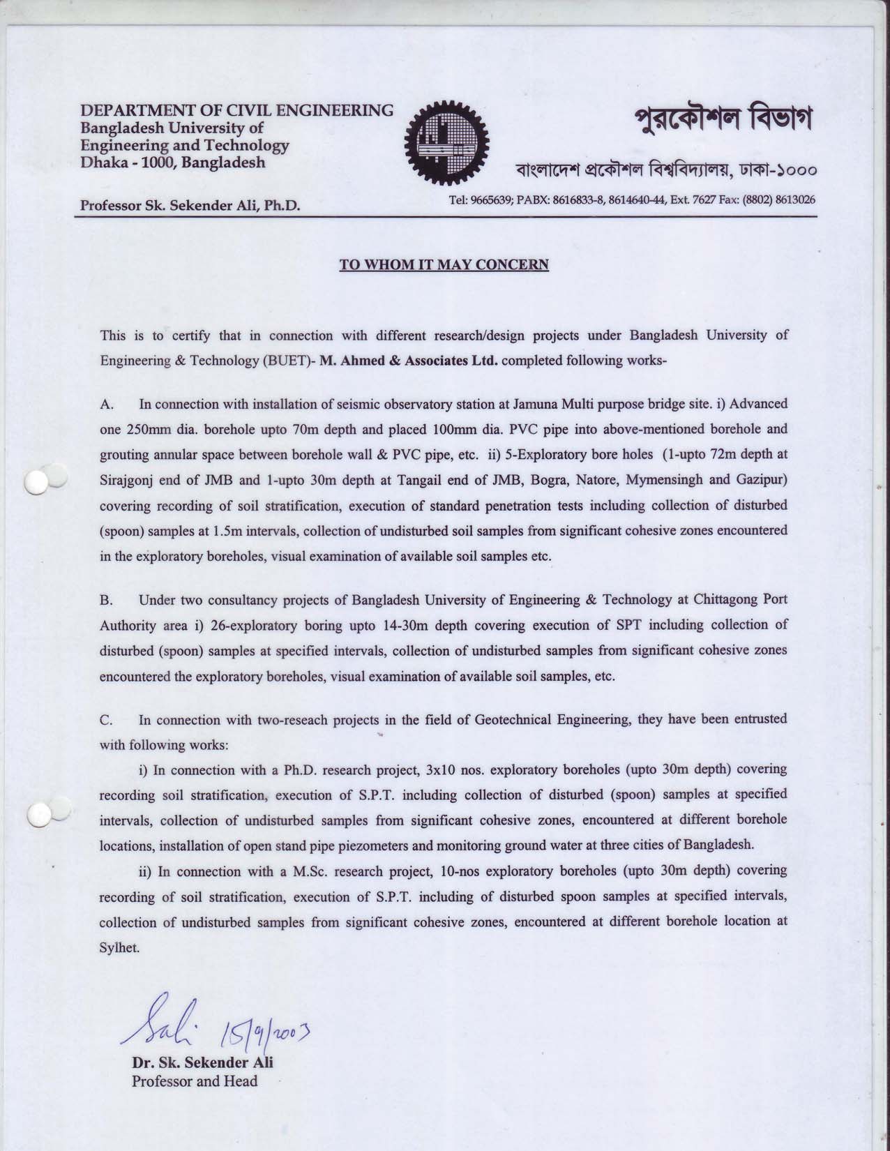 Since 1988, M. Ahmed & Associates Ltd. (formerly M. Ahmed & Co.) has been active in Civil Engineering and Geotechnical investigation, earning a solid reputation over 33 years. We have successfully completed various projects including highways, bridges, sub-stations, and machine foundations. Our expertise has been utilized by numerous government departments and private organizations, both local and international. These include well-known entities such as Bangladesh University of Engineering & Technology (BUET), Roads & Highways Department (RHD), and Louis Berger International Inc. (LBI), among many others.
