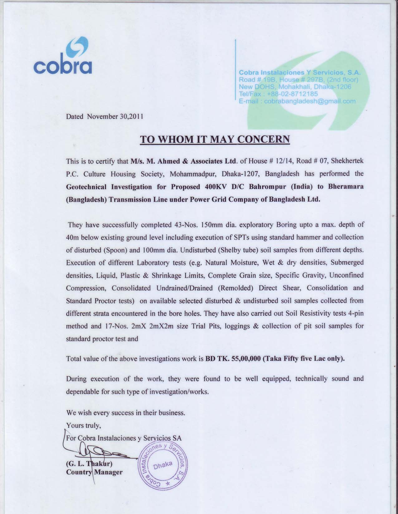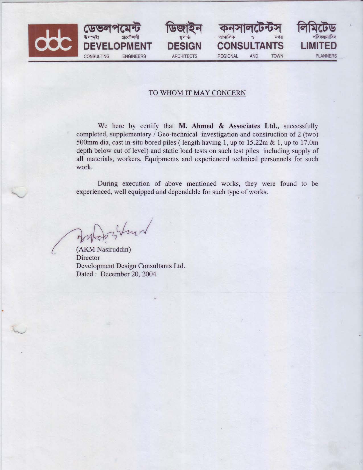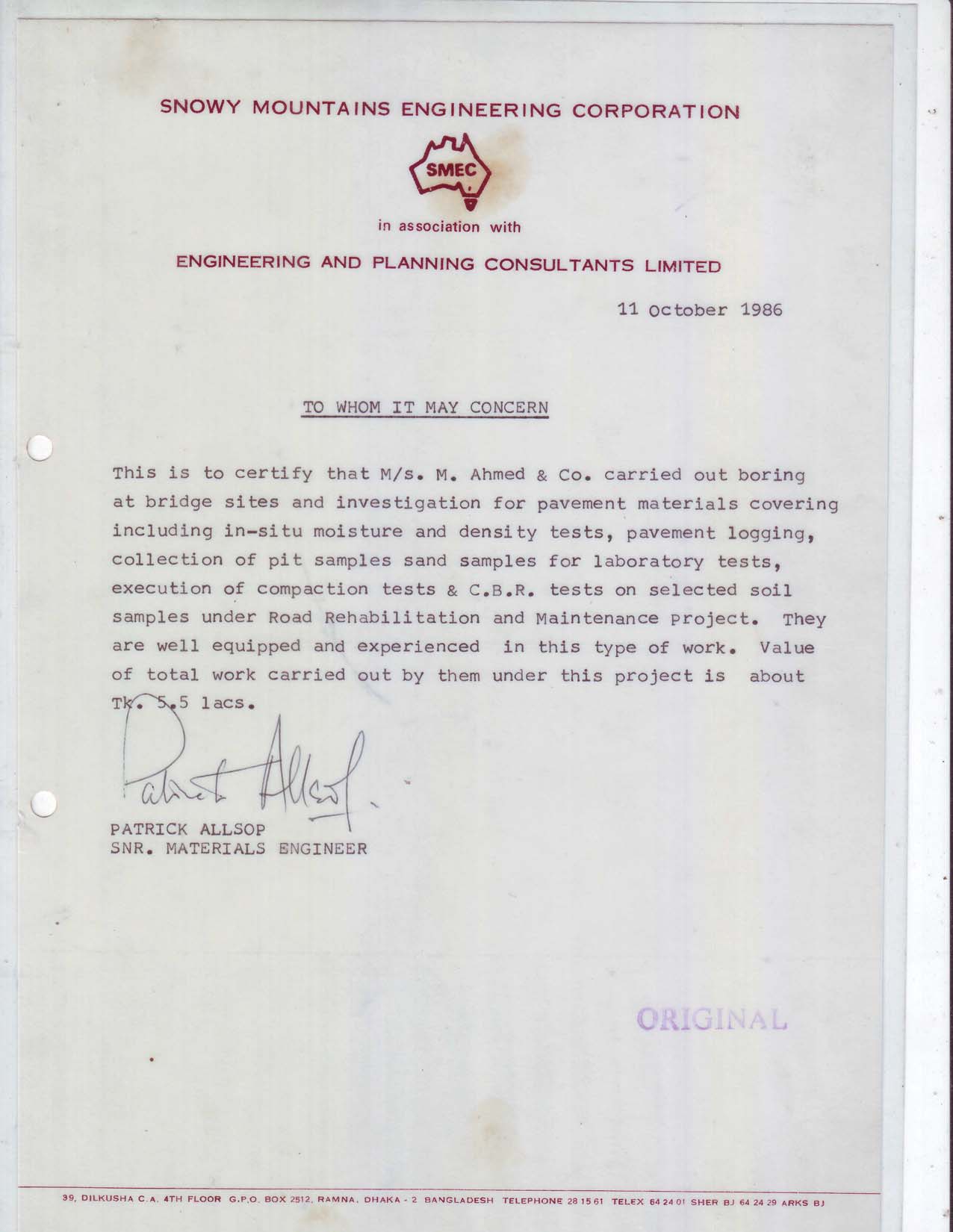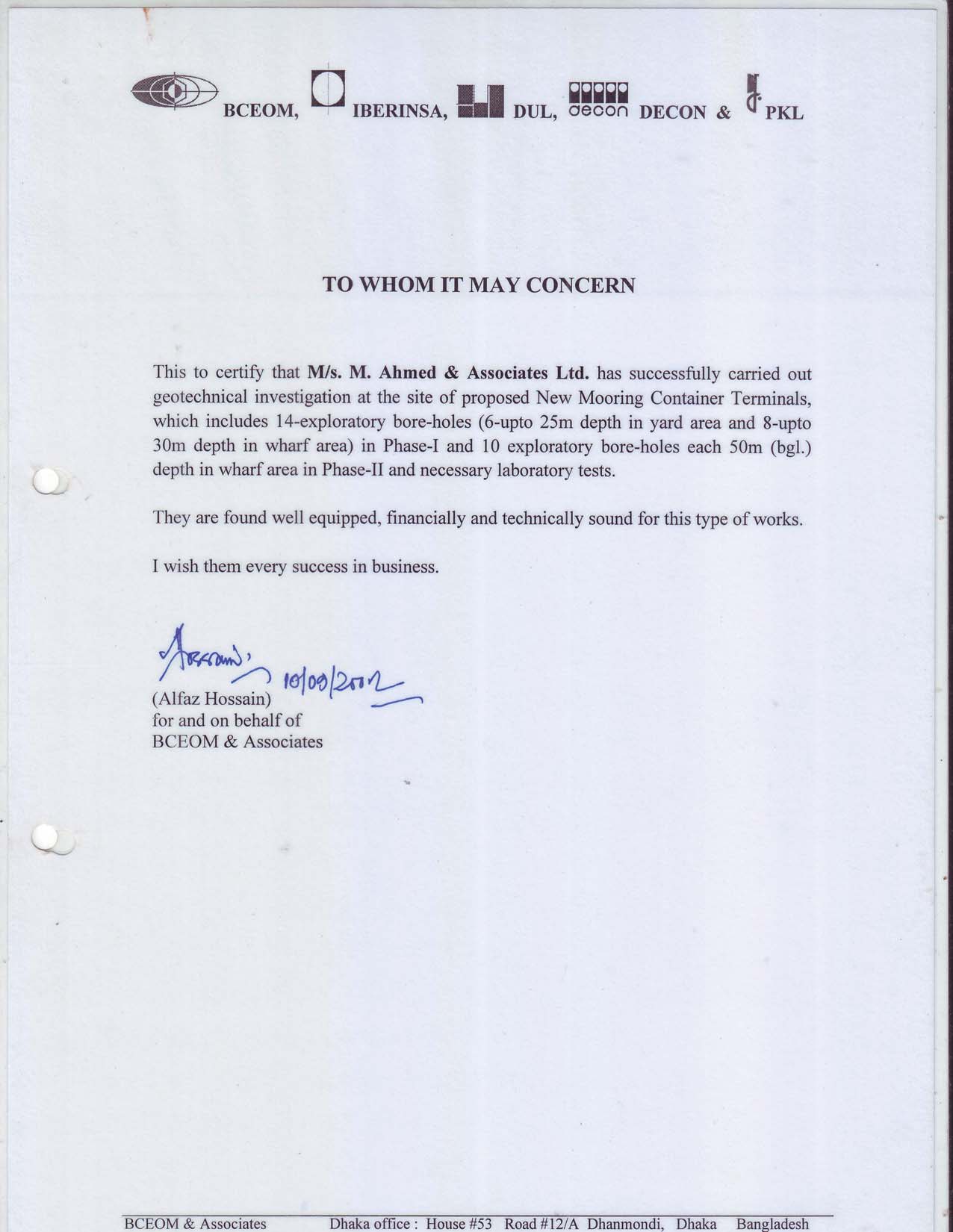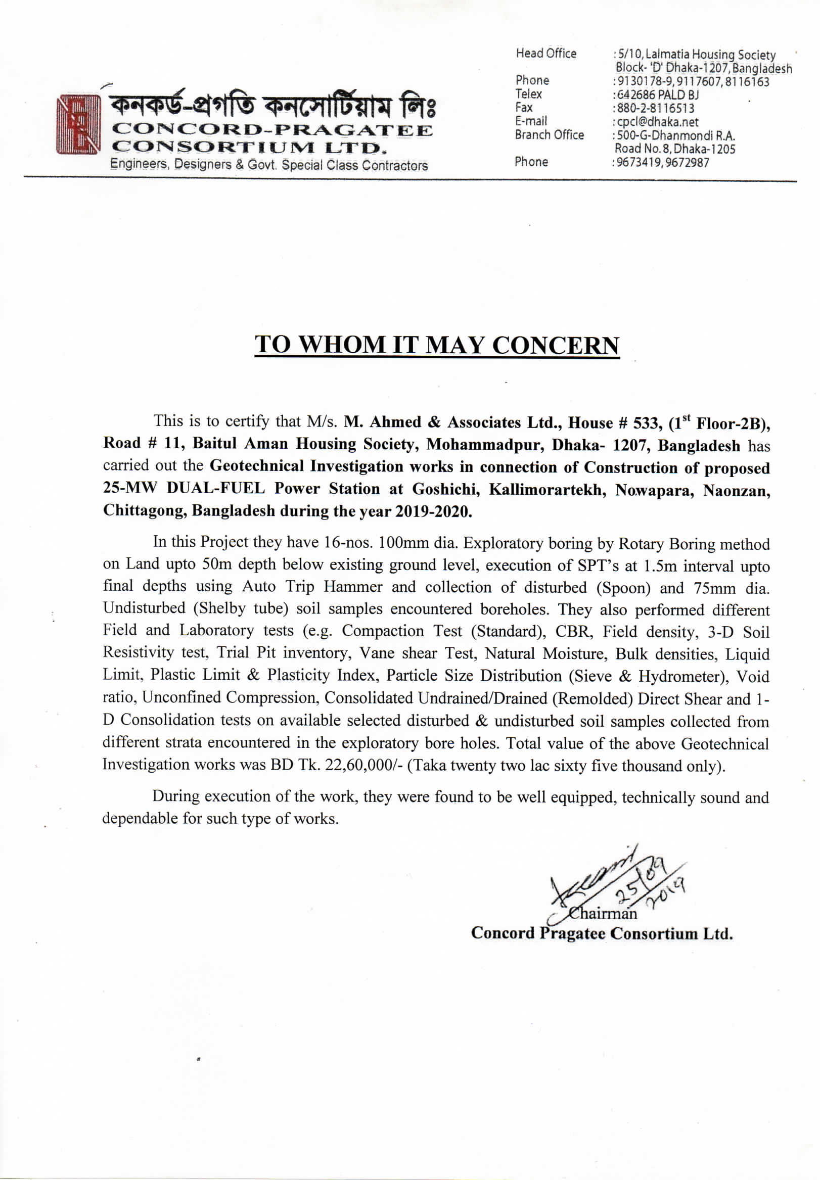Since 1988, M. Ahmed & Associates Ltd. (formerly M. Ahmed & Co.) has been active in Civil Engineering and Geotechnical investigation, earning a solid reputation over 33 years. We have successfully completed various projects including highways, bridges, sub-stations, and machine foundations. Our expertise has been utilized by numerous government departments and private organizations, both local and international. These include well-known entities such as Bangladesh University of Engineering & Technology (BUET), Roads & Highways Department (RHD), and Louis Berger International Inc. (LBI), among many others.